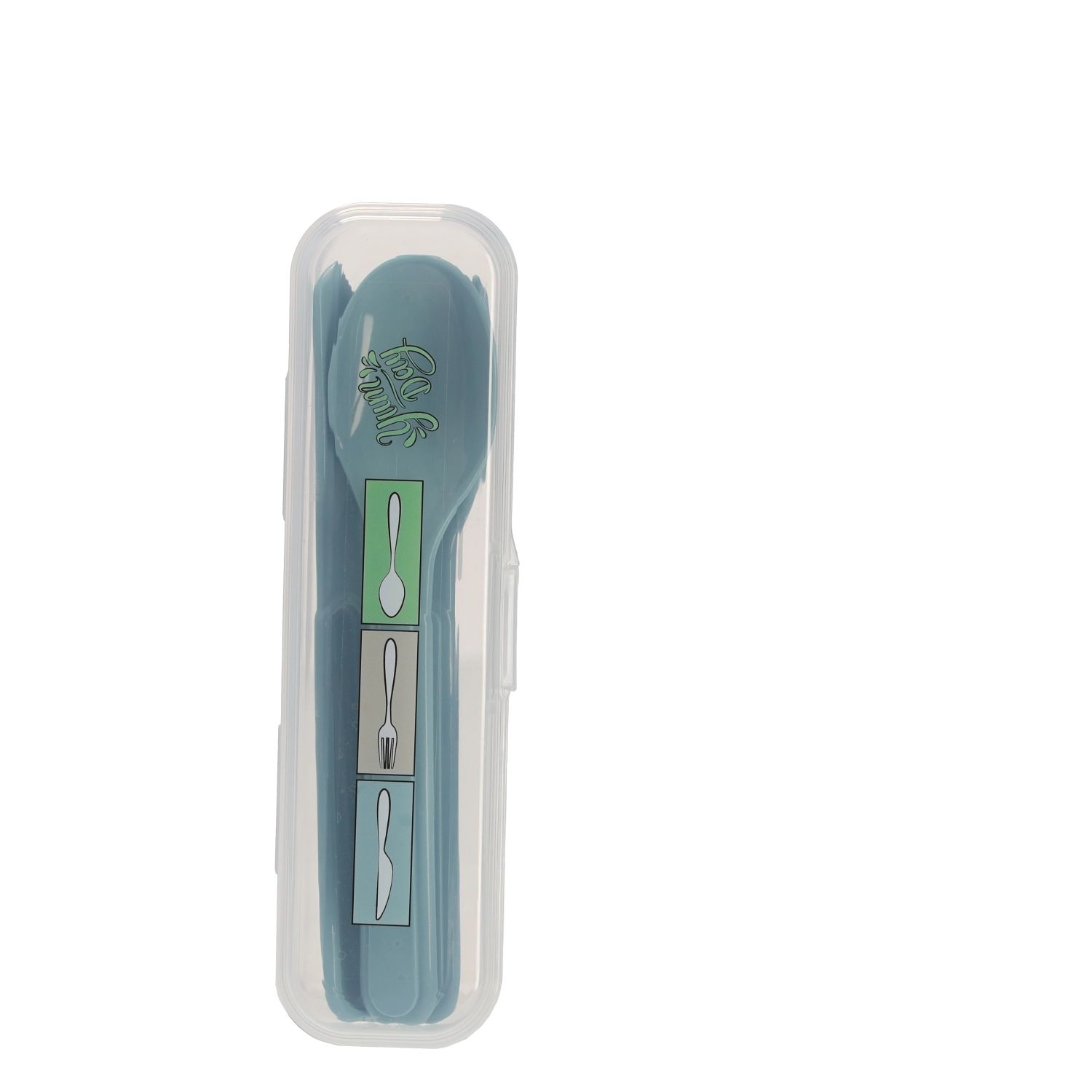 Praktická sada plastového príboru v cestovnom puzdre obsahuje lyžicu, vidličku a nôž v elegantnej modrej farbe. Vďaka kompaktnému puzdru zostáva príbor hygienický, čistý a vždy po ruke – ideálny do práce, do školy, na piknik aj na cesty.