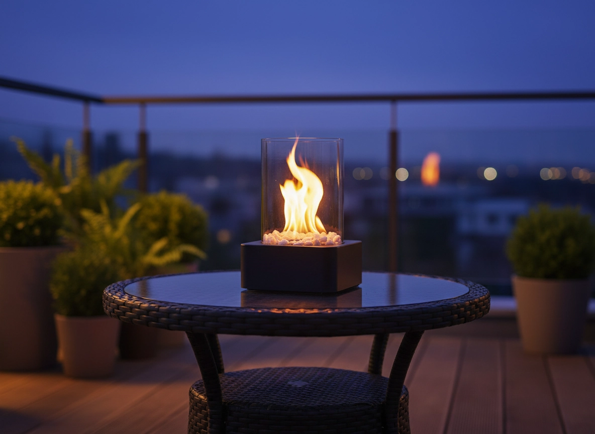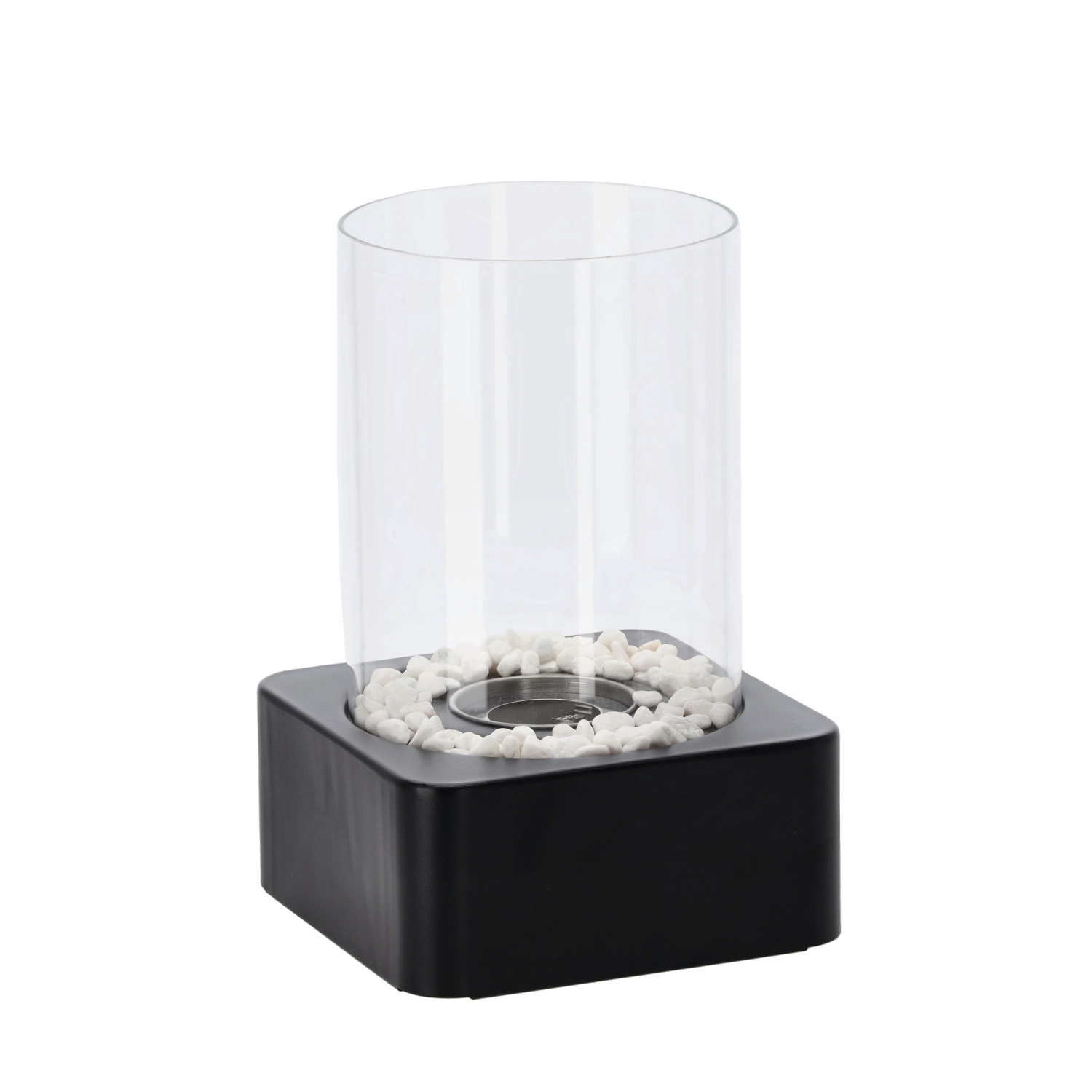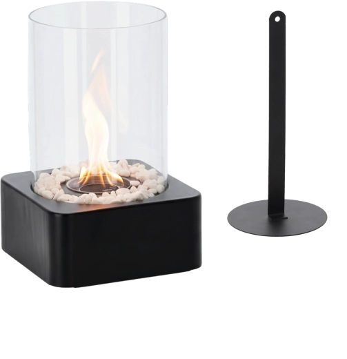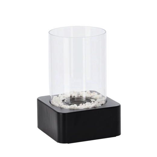 Stolový bio krb je štýlový doplnok, ktorý spája moderný vzhľad s prirodzeným svetlom plameňa. Matná čierna základňa s dekoratívnymi kamienkami a valcové sklo tvoria bezpečný štít proti vetru a zabezpečujú stabilné horenie pre útulnú náladu bez nutnosti komplikovanej inštalácie.