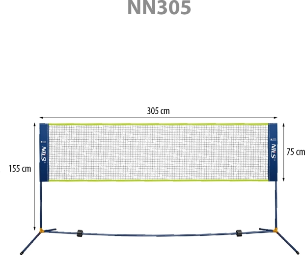Sieť NILS NN305 je navrhnutá pre rekreačný bedminton a rýchlu hru kdekoľvek. Oceľové trubky so spojením cez centrálny priečnik zaisťujú istú stabilitu a pevnosť konštrukcie. Vďaka bočným napínacím šnúram dosiahnete správne napnutie výpletu behom chvíľky, bez zložitého nastavovania.