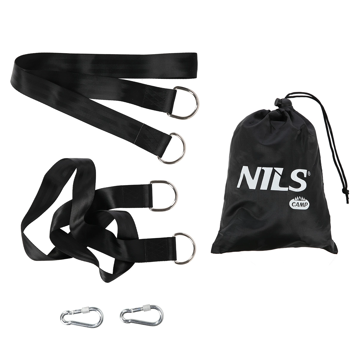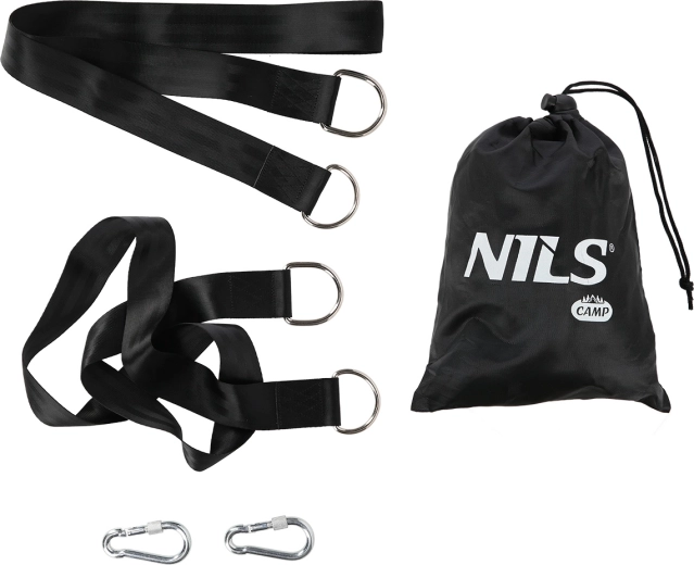 Univerzálna sada 2 popruhov NILS CAMP uľahčí bezpečné zavesenie hojdacích sietí, hojdačiek, posilňovacích systémov aj závesných kresiel. Vďaka pevnej polyesterovej tkanine, oceľovým D-okám a skrutkovacím karabínam získate rýchle a spoľahlivé uchytenie s nosnosťou až 500 kg a dĺžkou 150 cm každého popruhu.