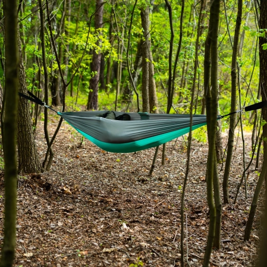 Popruhy ľahko omotáte okolo stromu alebo trámu a jedným zacvaknutím karabíny zavesíte hamaku, hojdačku či závesné kreslo.