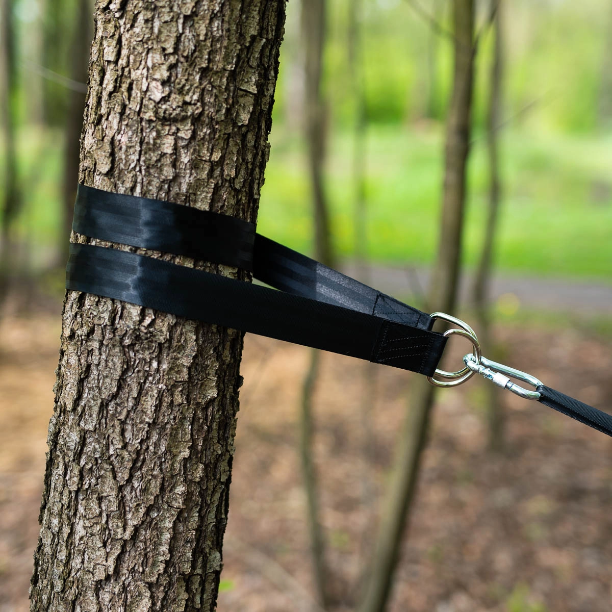 Každý popruh má 150 cm vrátane karabíny a šírku 5 cm pre šetrné obopnutie stromov či trámov. Nosnosť 500 kg vám dodá istotu pri zavesení hojdacej siete, hojdačky alebo brazílskeho kresla. V prípade potreby možno viac popruhov predĺžiť prepojením karabínami.
