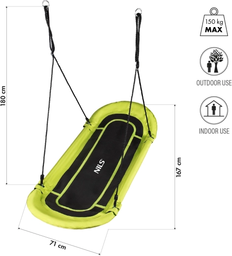 Užite si relax aj zábavu na záhrade s oválnou hojdačkou typu bocianie hniezdo NILS Camp NB5044. Ponúka extra priestrannú sedaciu plochu 167 × 71 cm, pevný oceľový rám a odolné materiály vhodné na celosezónne vonkajšie použitie. Vďaka nastaviteľným lanám až do 180 cm ju ľahko zavesíte na rôzne konštrukcie. Nosnosť 150 kg zaručuje bezpečné používanie pre deti aj dospelých.