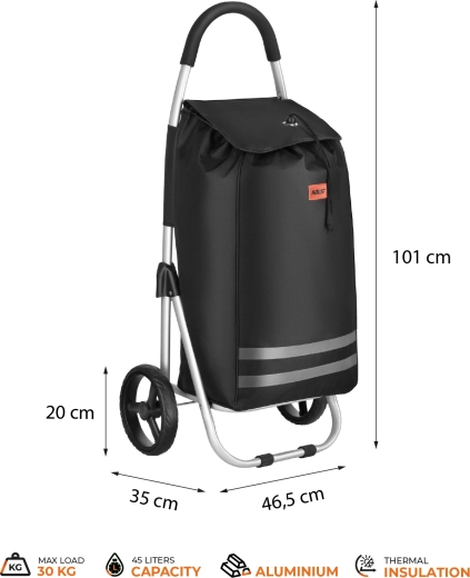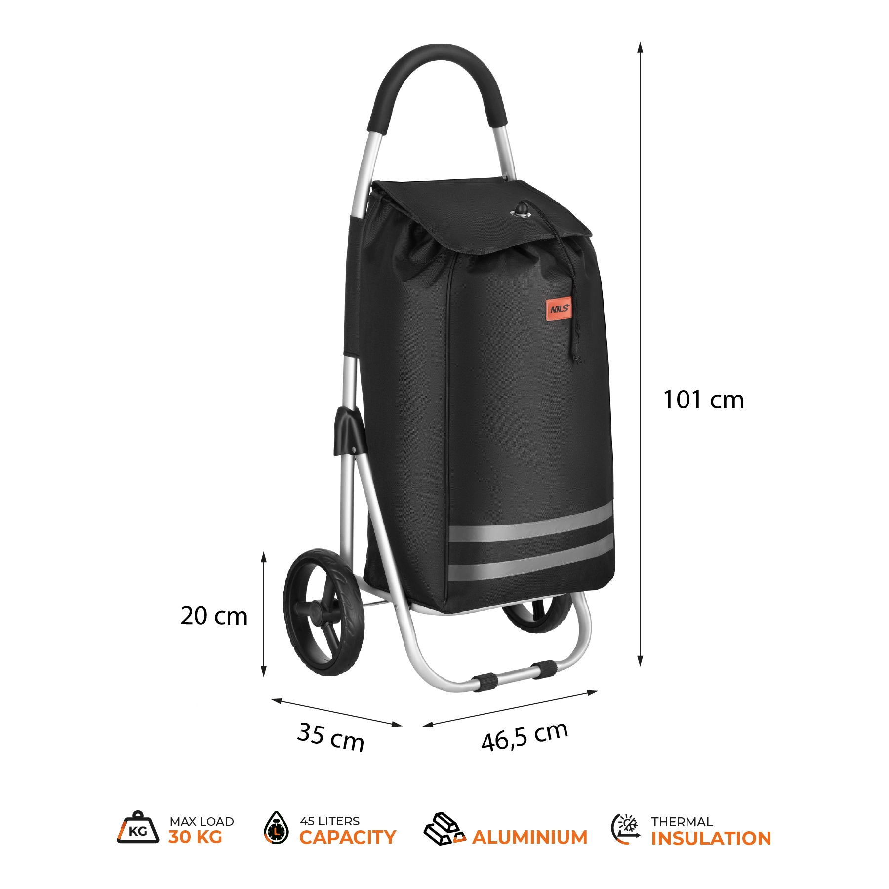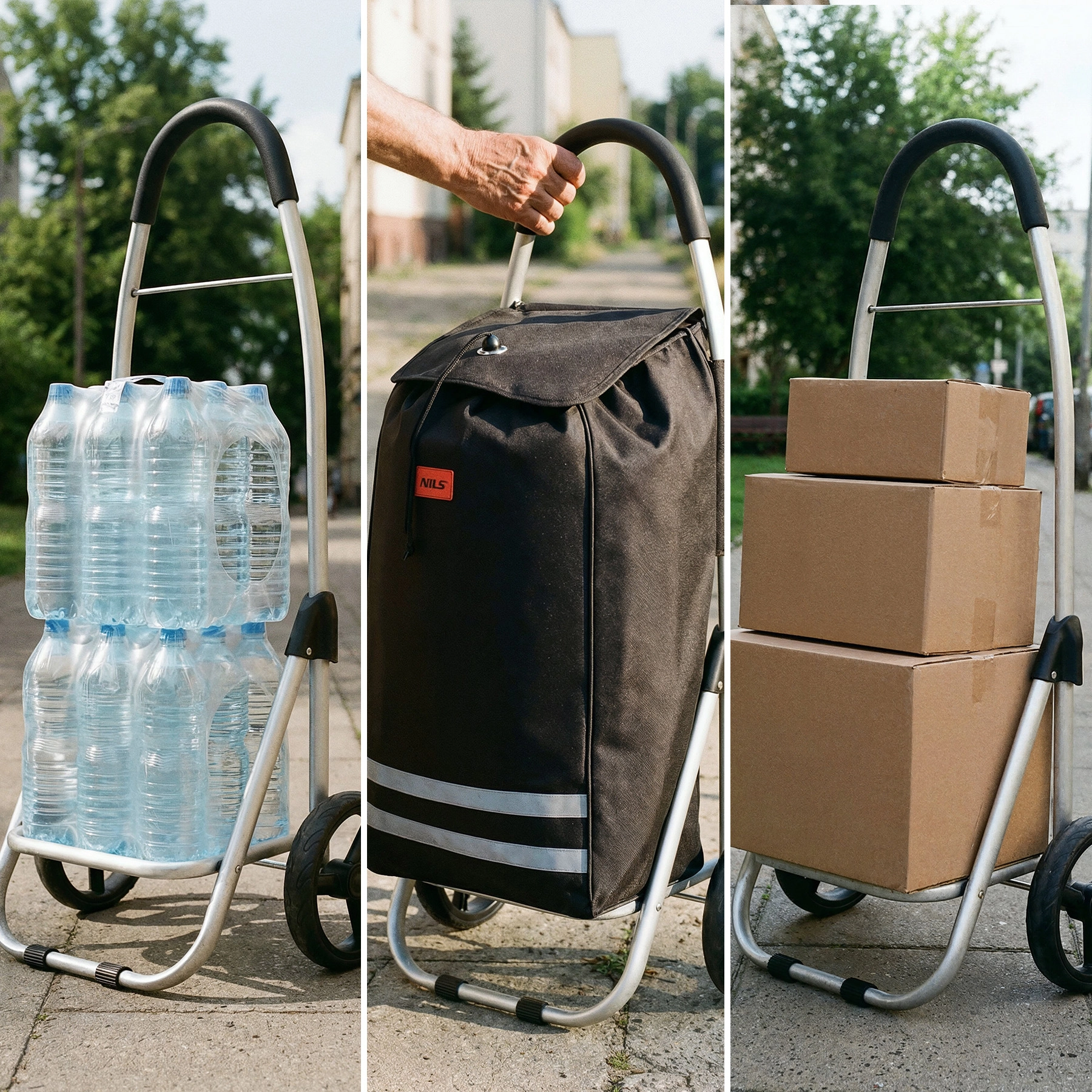 Nákupný vozík NILS je premyslený pomocník na každodenné nákupy. Odolná taška z polyesteru 900D s vnútornou termoizolačnou vrstvou udrží potraviny dlhšie čerstvé, zatiaľ čo hliníkový rám sa postará o stabilitu pri nízkej hmotnosti. Hlavná komora so sťahovacou šnúrkou a chlopňou bezpečne chráni obsah pred vypadnutím aj dažďom.