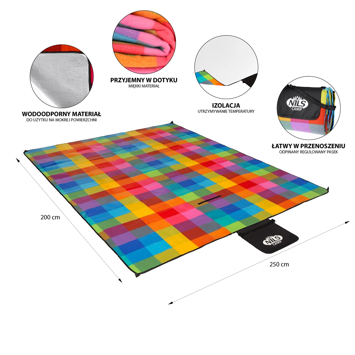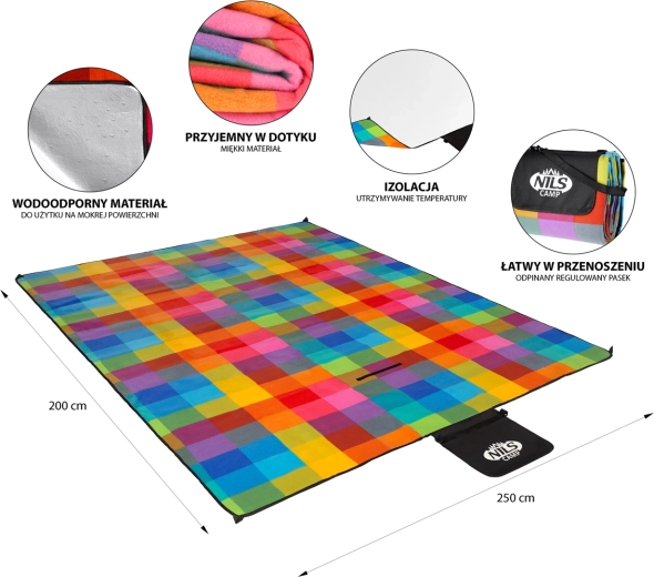 Deka sa rýchlo a úhľadne zloží do kompaktného balenia v tvare „tašky“, ktoré je vybavené uchami a popruhom cez plece. Vďaka veľkorysým rozmerom 200 × 250 cm poskytne dostatok priestoru pre rodinný piknik, hranie detí aj relax na pláži.