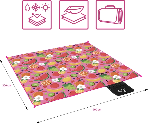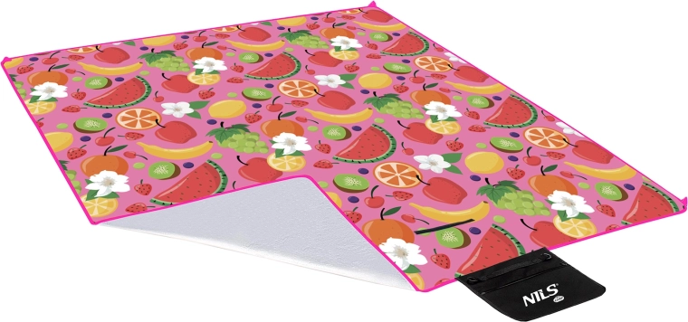 Pikniková deka NILS Camp Fruits je ideálna na pikniky, pláž, záhradu aj festivaly. Vrchný mäkký fleece je príjemný na dotyk, stredná penová výplň zvyšuje komfort sedenia a spodná vrstva z PE s hliníkovým záterom spoľahlivo chráni pred chladom a vlhkosťou. Vďaka rozmerom 200 × 200 cm poskytne pohodlie celej rodine.