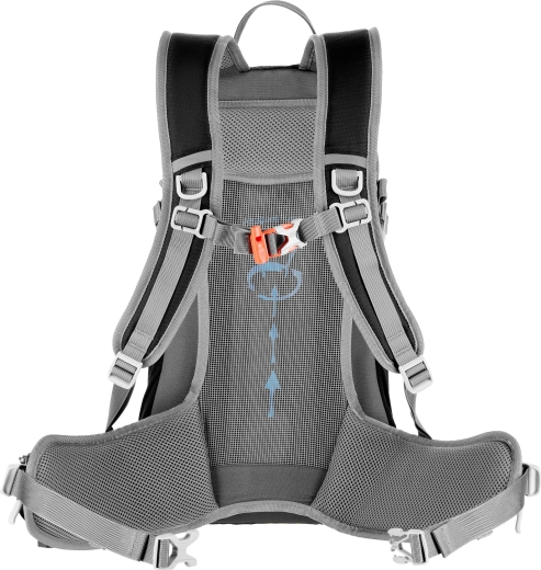 Pohodlné ramenné popruhy, hrudný popruh s píšťalkou a polstrovaný bedrový pás s vreckami udržia batoh stabilný aj v náročnom teréne.
