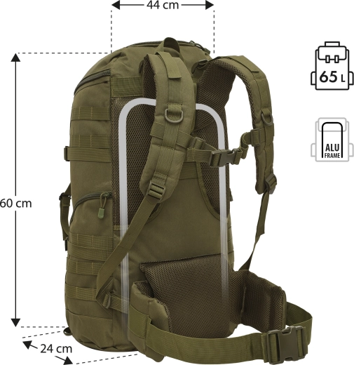 Pre milovníkov taktického štýlu nechýba možnosť personalizácie pomocou suchých zipsov (nášivky nie sú súčasťou). Vďaka hmotnosti len 1,4 kg a objemu 65 l ide o spoľahlivý batoh na viacdňové prechody aj intenzívne outdoorové aktivity.