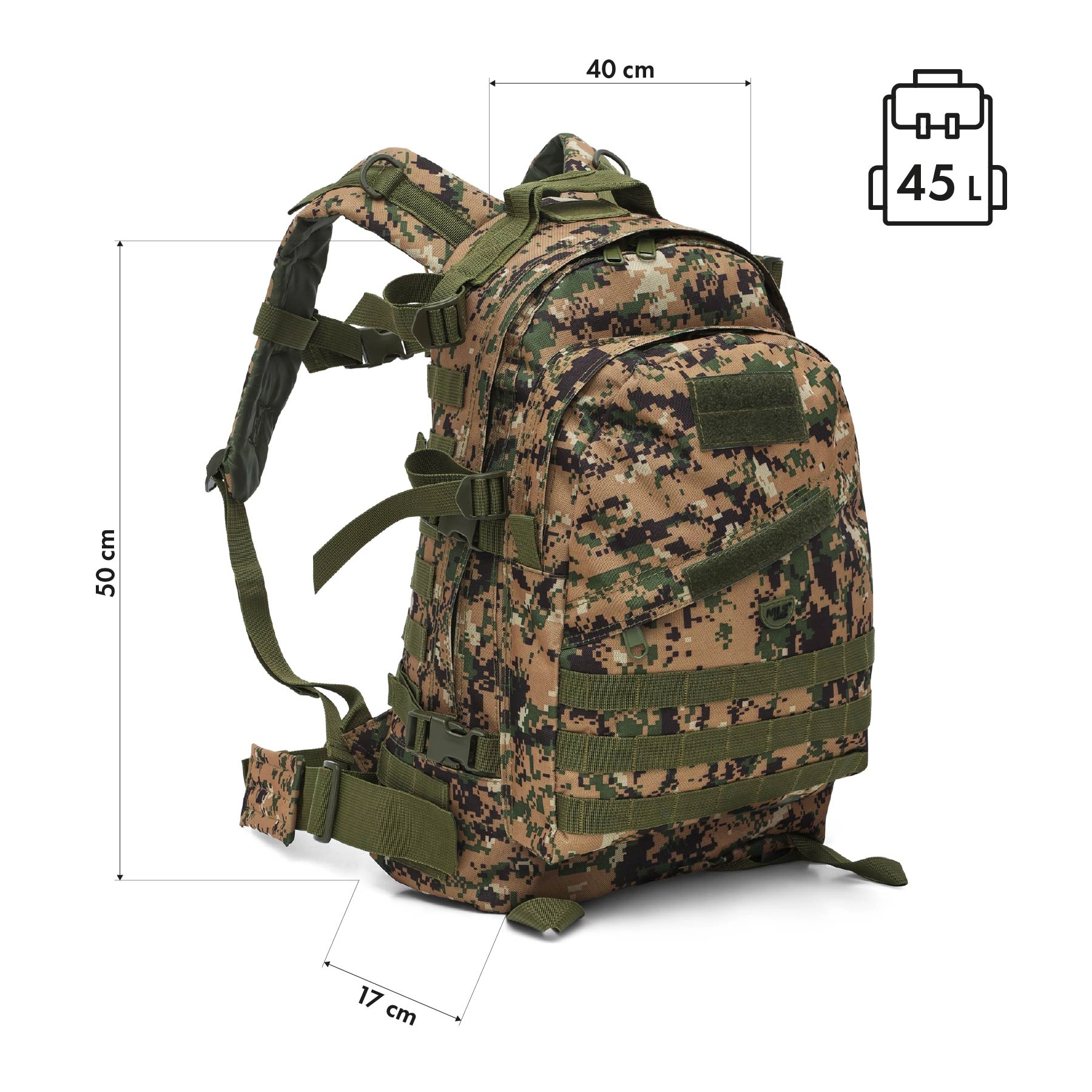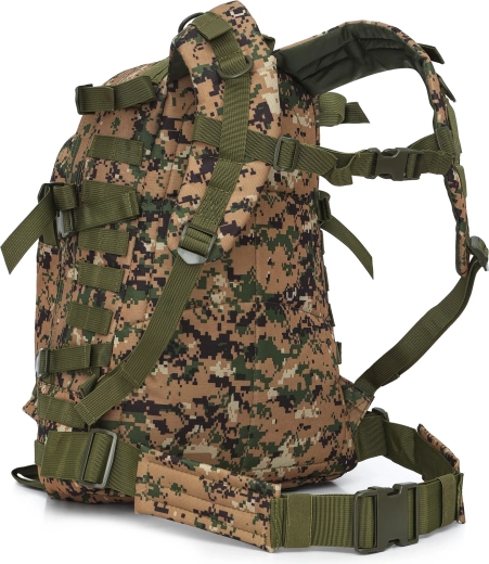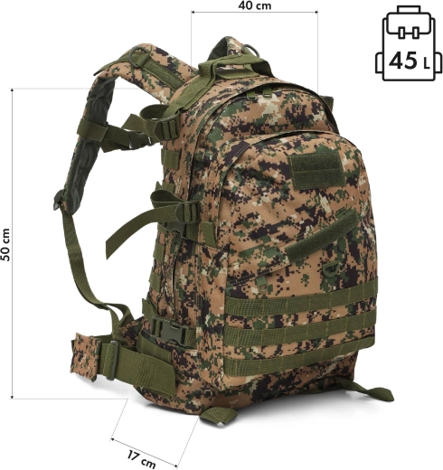 Tento maskáčový batoh kombinuje funkčnosť, nízku hmotnosť a taktický dizajn. Materiál z odolného polyesteru s PVC záterom a vnútornou podšívkou 210D chráni obsah pred oderom a vlhkosťou, zatiaľ čo hmotnosť iba 1 kg zaisťuje pohodlné každodenné používanie.