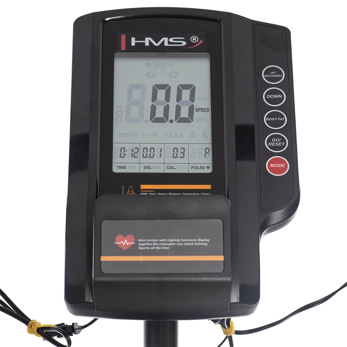 Veľký LCD displej zobrazuje kľúčové tréningové hodnoty (čas, vzdialenosť, rýchlosť, kalórie, pulz), vrátane funkcií recovery, body fat a scan. Vďaka 6 úrovniam nastavenia sedla, transportným kolieskam a pevnej oceľovej konštrukcii je trenažér pohodlný, stabilný a ľahko premiestniteľný – pripravený na každodenný výkon.