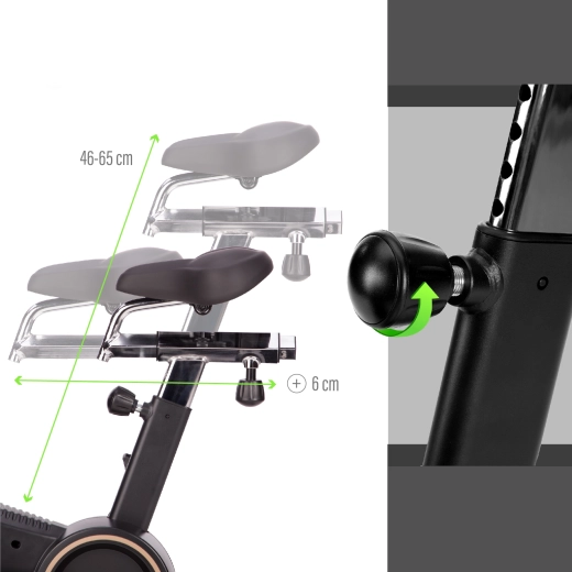 Sledujte čas, vzdialenosť, rýchlosť, tep, kalórie aj RPM na podsvietenom LCD. Sedlo nastavíte vertikálne (10 polôh) aj horizontálne pre ideálny posed.