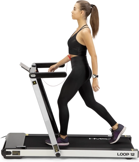HMS LOOP 12 kombinuje moderný dizajn, úsporu miesta a spoľahlivý výkon na každodennú chôdzu aj ľahký beh. Bežecká plocha 125 × 45 cm so 6-bodovým odpružením zo silikagélu šetrí kĺby a zvyšuje komfort tréningu. Po sklopení konzoly dosahuje pás nízky profil a vďaka dvom párom koliesok ho ľahko presuniete dopredu/dozadu aj do strán.