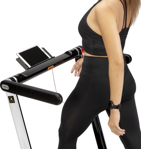 Bežecká plocha 125 × 45 cm so 6-bodovým odpružením znižuje záťaž na kĺby. Nechýba bezpečnostný kľúč, madlá a rýchle voľby rýchlosti 3/5 km/h.
