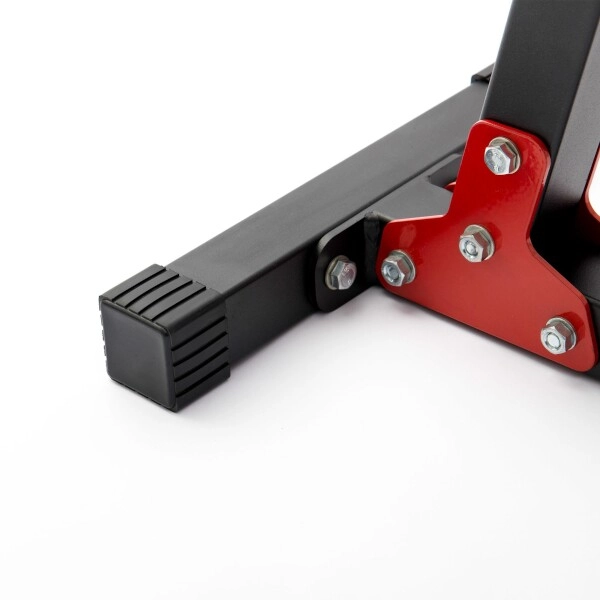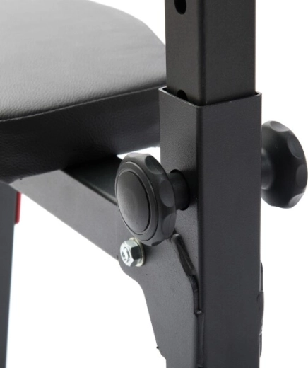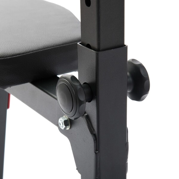 Ergonomicky tvarované polstrovanie z kvalitnej syntetickej kože s dvojitým prešitím poskytuje pohodlie aj pri náročnom tréningu. Odkladacie háky s hrubou ochrannou gumou minimalizujú hluk a zabraňujú poškriabaniu osi aj konštrukcie. Práškovaný povrch chráni rám pred oderom a koróziou a gumené nožičky udržiavajú lavicu pevne na mieste bez poškodenia podlahy.
