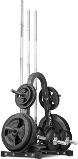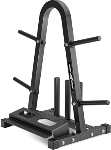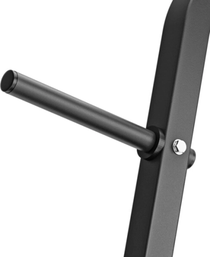Stojan je vybavený 4 tŕňmi na kotúče pre efektívnu organizáciu závaží, 3 zvislými tubusmi pre obojručné osi s priemerom 28–30 mm a praktickou spodnou policou pre 2 jednoručné činky. Vďaka premyslenému rozloženiu šetrí miesto a zvyšuje bezpečnosť pri tréningu.