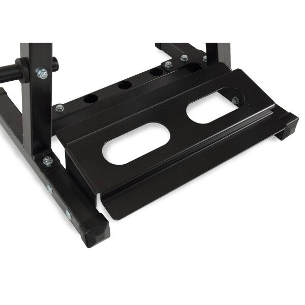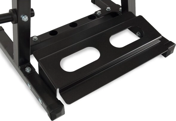Vďaka šikovnému rozvrhnutiu odkladacích bodov uložíte na jednom mieste kotúče s vrtaním 25 mm, osi 30 mm aj jednoručné činky. Šetríte priestor, skracujete čas medzi sériami a minimalizujete riziko poškodenia vybavenia.