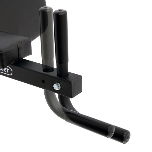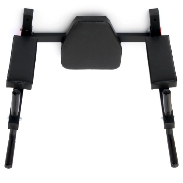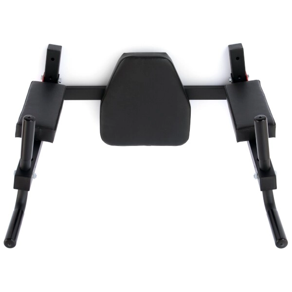 Šírku úchopov možno jednoducho prenastaviť na 43 alebo 47 cm pomocou jediného skrutky – behom pár sekúnd tak získate ideálnu ergonómiu pre dipy aj priťahovanie kolien. Montáž na stenu prebieha pomocou štyroch skrutiek (nie sú súčasťou balenia); zvoľte vhodné kotvenie podľa materiálu steny.