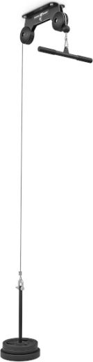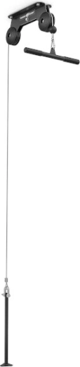 Súčasťou balenia je tricepsový adaptér, ktorý rozšíri možnosti tréningu o sťahovanie kladky na triceps, priťahovanie či bicepsové ťahy. Gumený doraz na konci lanka chráni konštrukciu pri náhlom pustení. Montáž do stropu šetrí miesto a umožňuje plynulé vykonávanie cvikov, ako sú lat pulldown, tricepsové sťahovanie či priťahy v sede s vlastným úchopom.