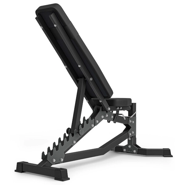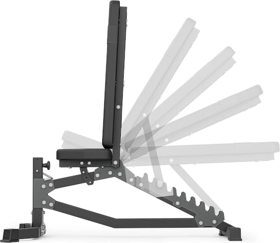 Ladder systém s laserom vypaľovanými zarážkami umožňuje 10 presných polôh vrátane šikmého sklonu -21°, takže ľahko prispôsobíte uhol pre tlaky, príťahy aj bicepsové cviky v sede.