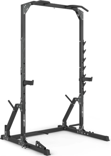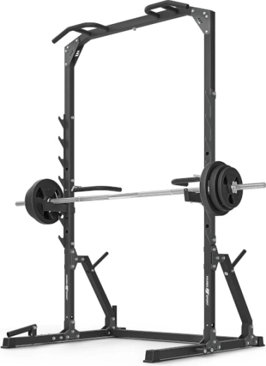 Robustná posilňovacia klietka na domáci tréning s činkou aj vlastnou váhou. Ponúka nosnosť 250 kg, integrovanú hrazdu s viacerými úchopmi, 7 párov hákov na os, bezpečnostné vzpery, opierky na DIPy a kliky a tŕne na závažie pre vyššiu stabilitu.