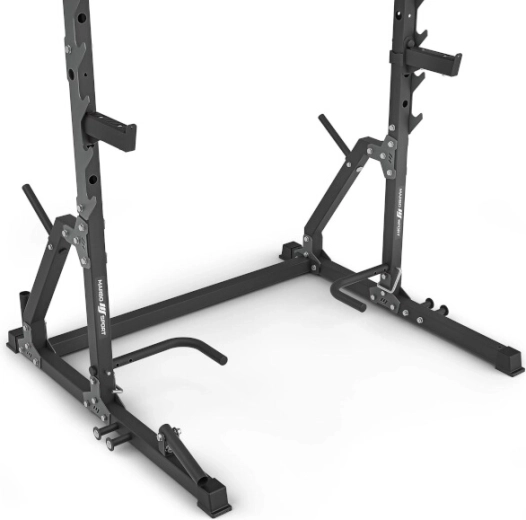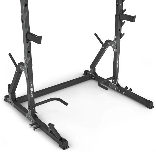 Po stranách rámu nájdete 7 párov hákov na komfortné odkladanie osi (73–155 cm) a bezpečnostné vzpery s rýchlym zaistením v 4 polohách (75–118 cm). Z vnútornej strany sú opierky na DIPy a kliky s priemerom 3 cm, dvoma výškovými úrovňami (17 a 105 cm) a 5 šírkovými nastaveniami (56–74 cm). Zadné tŕne slúžia ako stojan na kotúče a zároveň zvyšujú stabilitu; nechýba držiak na os (Ø 30 mm) a predný multiosový kĺb na tréning s osou.