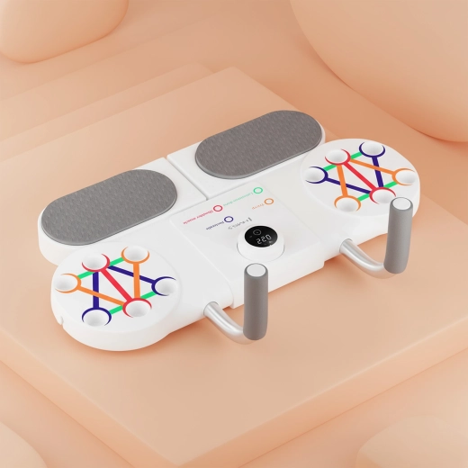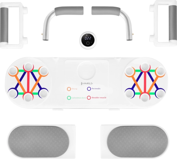 Kompaktná a univerzálna pomôcka na domáci tréning hornej časti tela a stredu. Doska HMS DBP03 spája stabilnú základňu na plank, nastaviteľné podpery na kľuky a inteligentný počítač s optickým (IR) senzorom, ktorý automaticky počíta opakovania. Vďaka farebnému značeníu úchopov ľahko zacielite na hrudník, ramená, tricepsy aj chrbát, zatiaľ čo protišmyková textúra a penové rukoväte a lakťové podložky zaistia pohodlie a bezpečnosť.
