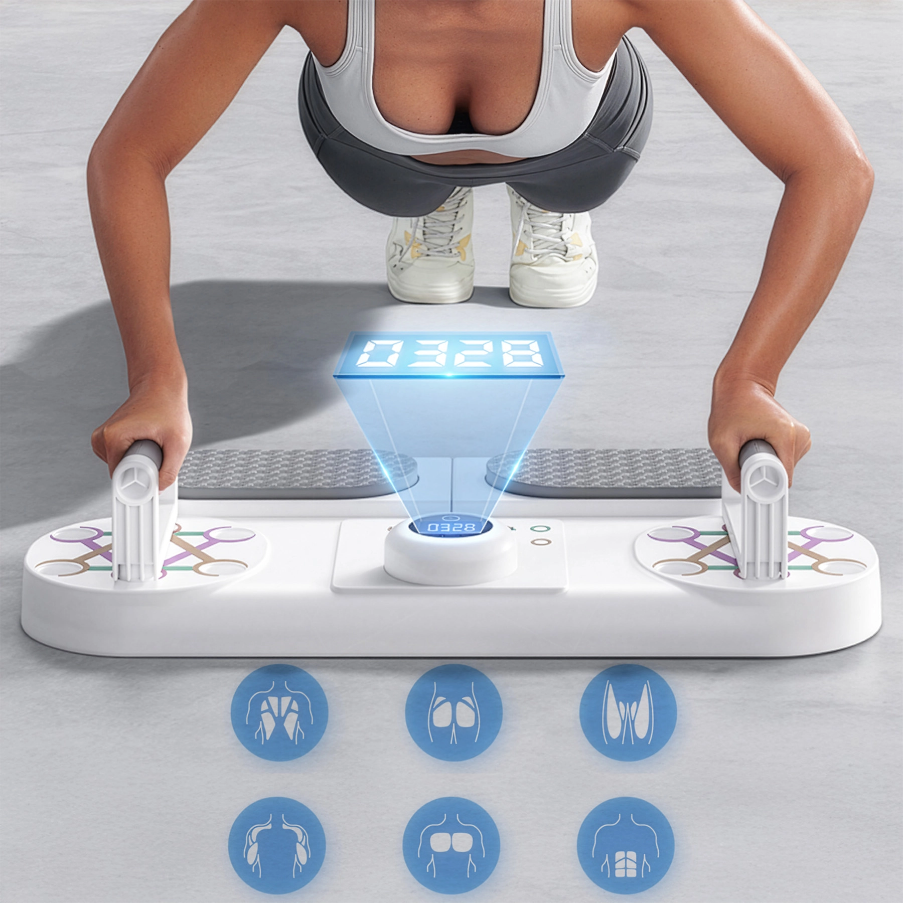Široká základňa s protišmykovou textúrou a mäkké lakťové podložky zvyšujú stabilitu aj komfort pri planku a izometrických cvikoch. Ergonomické rukoväte šetria dlane a zápästia.