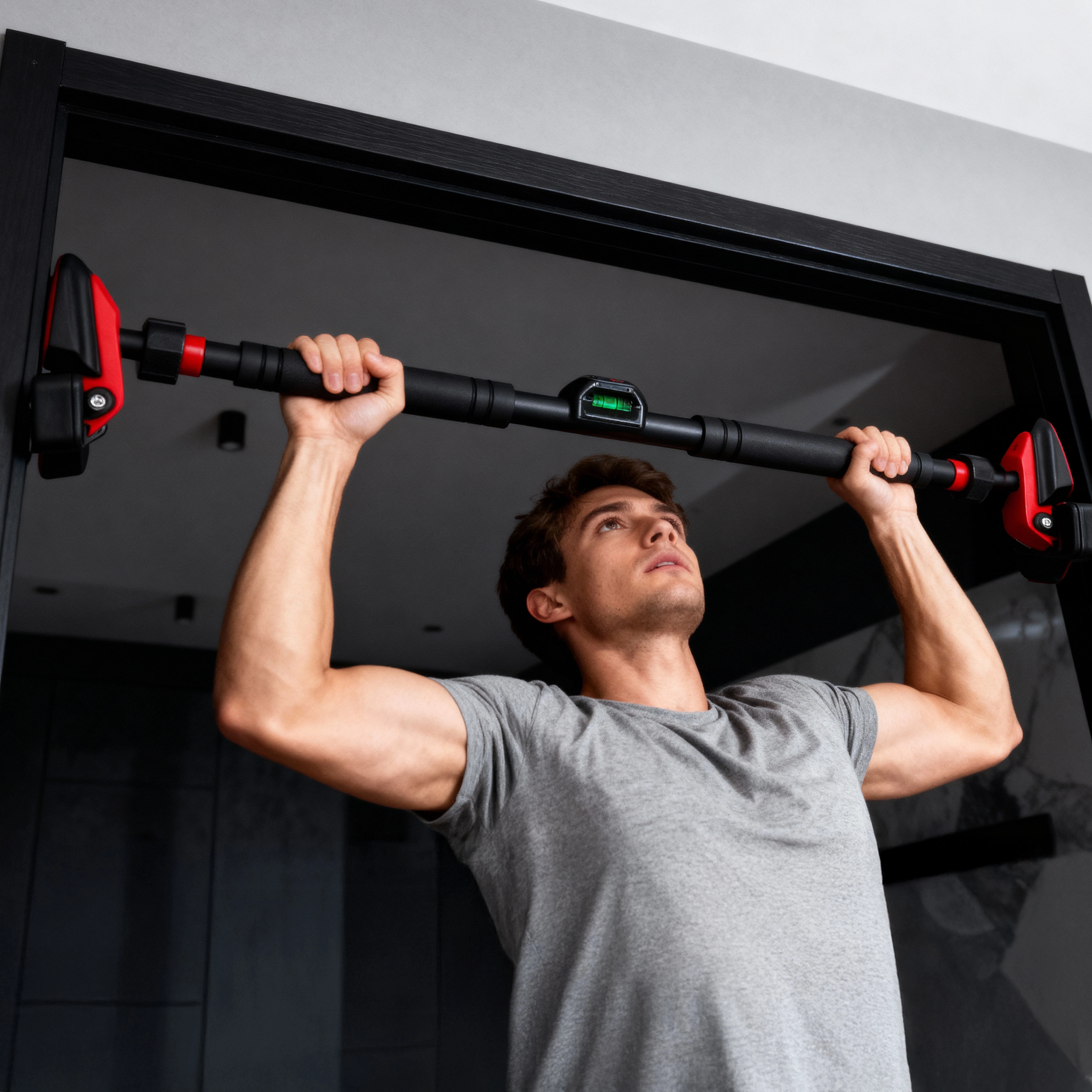 Robustná teleskopická viacvrstvová oceľ zabezpečuje nosnosť až 210 kg, zatiaľ čo bezpečnostný zámok typu mortise & tenon bráni samovoľnému uvoľneniu. Mäkké protišmykové oporné plochy s trojzónovou textúrou chránia zárubňu a držia hrazdu pevne na mieste. Montáž prebieha úplne bez vŕtania a usadenie uľahčí integrovaná vodováha. Penové úchopy sú pohodlné a odolné aj pri dlhšom tréningu.