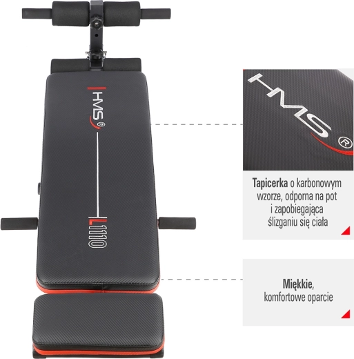 Polohovateľná šikmá lavica HMS L1110 je spoľahlivý parťák do domácej posilňovne. Stabilná oceľová konštrukcia a kvalitné spracovanie zaisťujú bezpečný tréning, zatiaľ čo mäkké polstrovanie opier a penové valce poskytujú maximálne pohodlie. Čalúnenie s karbónovým vzorom je odolné voči potu a pomáha zabrániť šmýkaniu počas cvičenia.