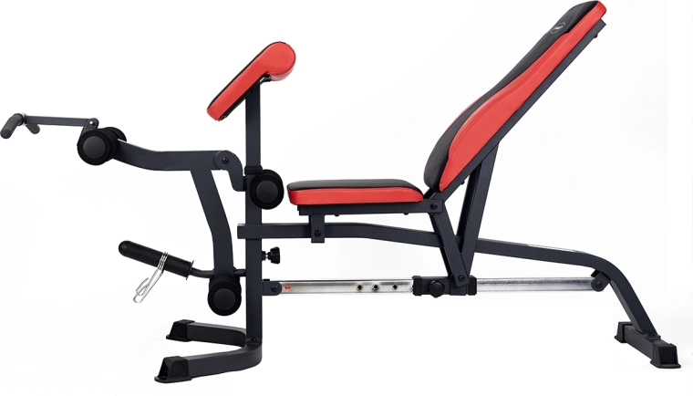 Operadlo nastavíte od vertikálnej polohy až do negatívu s jemným krokovaním po 6 cm. Trojúrovňová bicepsová opierka sa prispôsobí vašej výške aj štýlu cvičenia. Praktické stojany na činku s roztečou 91 cm a dlhé tŕne na kotúče uľahčia rýchlu zmenu záťaže.