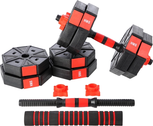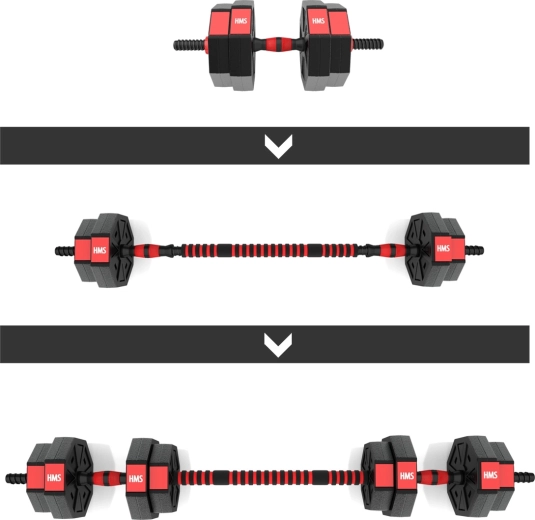 Sada HMS SGC15 je kompletné riešenie pre domáce posilňovanie: dve jednoručky možno pomocou spojovacieho dielu rýchlo premeniť na obojručnú činku. Odolné kotúče z PVC plnené cementom a závitové hriadele s hviezdicovými uzávermi zabezpečujú stabilitu závaží počas cviku. Šesťhranný tvar navyše bráni odvaľovaniu kotúčov.