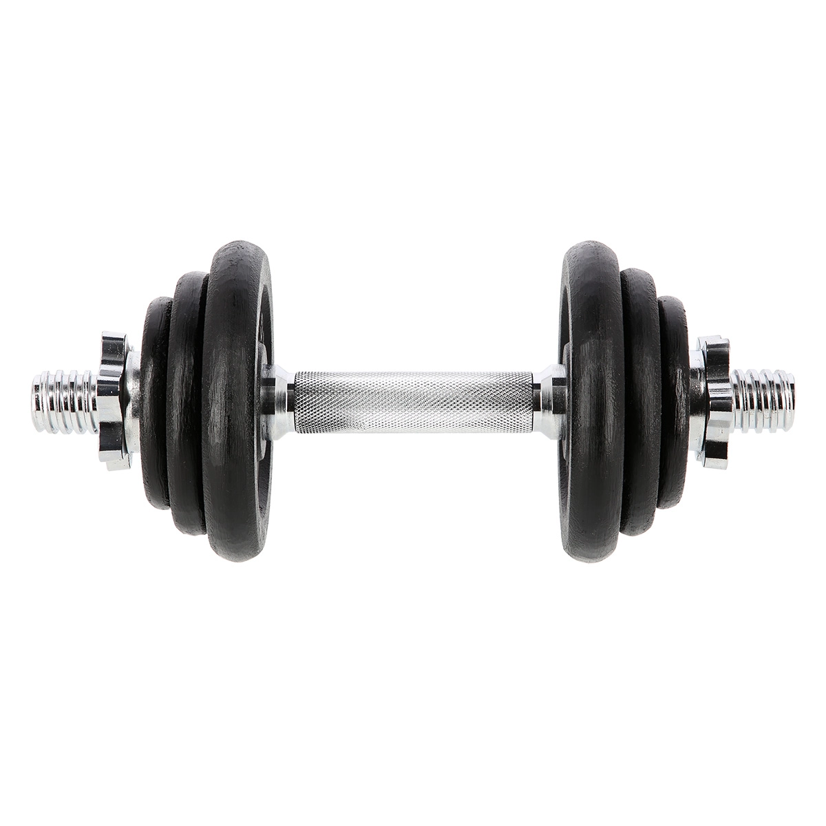 Súčasťou balenia sú liatinové kotúče v niekoľkých hmotnostiach pre jemnú progresiu a efektívny silový tréning. Drážkovaný (knurling) úchop zaisťuje spoľahlivú kontrolu aj pri vyššej záťaži.