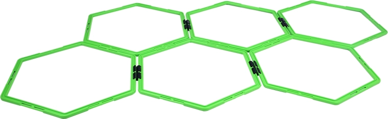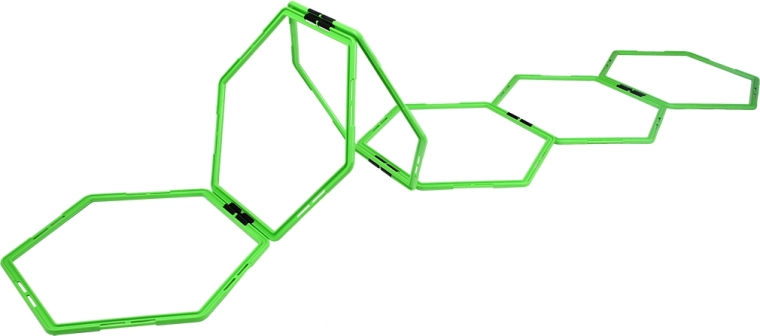 Agility rebrík HMS SKR06 tvoria šesť zelených šesťuholníkov, ktoré spojíte pomocou klipsov do priamky, cikcaku alebo uzavretých tvarov. Variabilná konfigurácia rozvíja rýchle nohy, koordinačné schopnosti aj stabilitu členkov – ideálne pre futbal, atletiku, bojové športy aj kruhový tréning.
