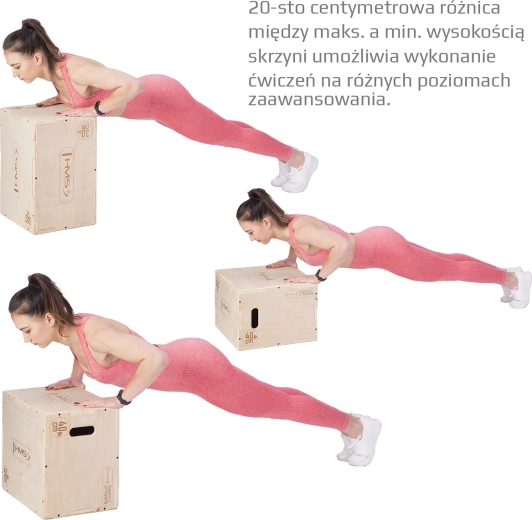 Plyometrický box HMS DSC04 je všestranná cvičebná pomôcka na zlepšenie výbušnosti, sily a stability. Vďaka trom stranám s rôznou výškou umožňuje ľahko meniť intenzitu tréningu jednoduchým otočením boxu. Odolná 18 mm preglejka a vystužené spoje s puzzle výrezmi zabezpečujú vysokú stabilitu a dlhú životnosť aj pri častom používaní.