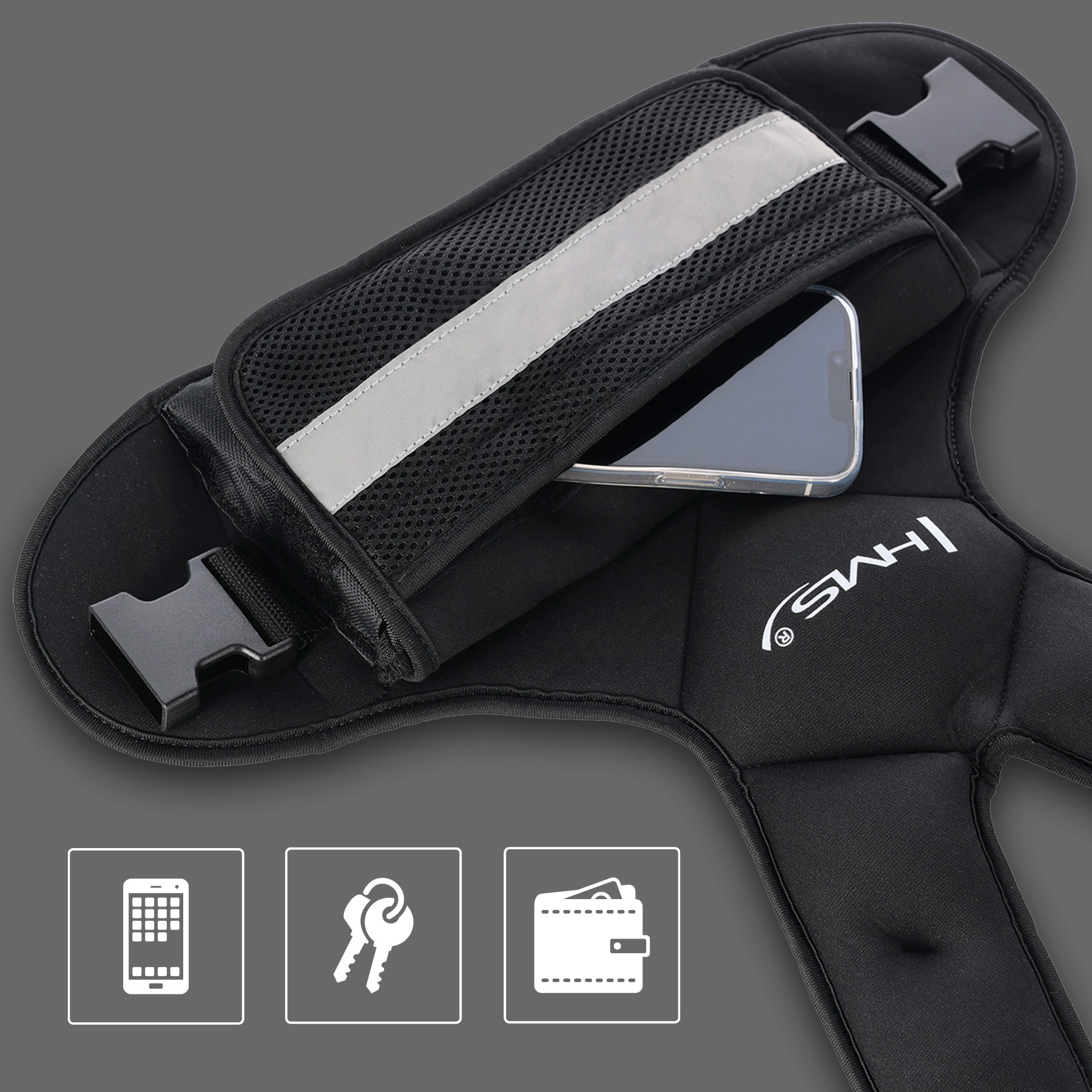 Neoprénový, na dotyk mäkký materiál je odolný voči potu a pomáha veste držať na mieste aj pri intenzívnom pohybe. Nastaviteľné bočné popruhy zaistia isté a individuálne usadenie na postave. Praktické sieťované vrecko pojme telefón či kľúče a reflexné prvky zvyšujú bezpečnosť pri tréningu vonku za zhoršenej viditeľnosti.