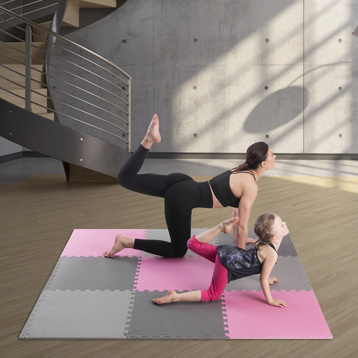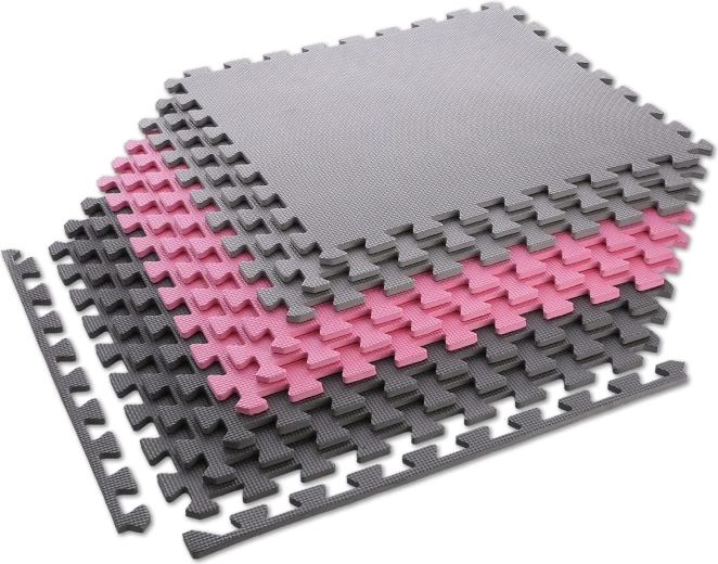 Každý diel má zámky po obvode, takže môžete skladať malé zóny aj pokrytie celej miestnosti. Balenie obsahuje 9 štvorcových dielov v ružovej, svetlej a tmavosivej farbe a 12 ukončovacích líšt pre čisté, rovné okraje bez zúbkov.