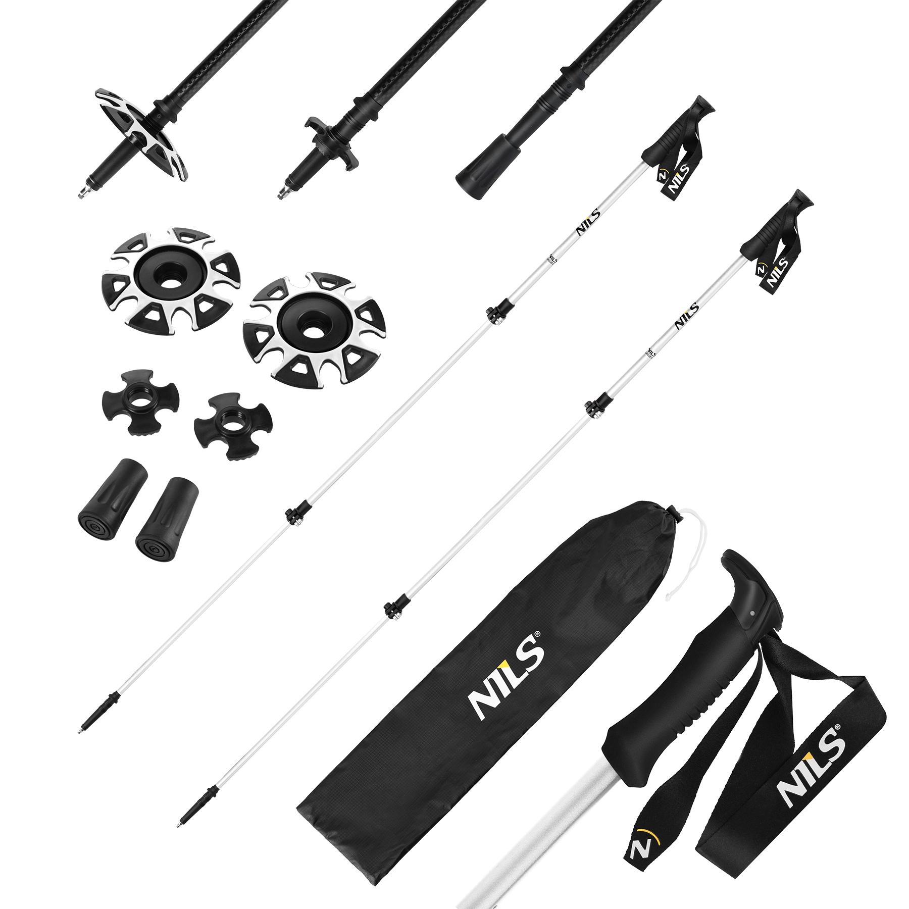 Ergonomické rukoväte z EVA peny znižujú únavu rúk, dobre odvádzajú pot a držia isto aj za vlhka. V balení nájdete dve sady tanierikov, gumové koncovky a prepravný vak – ste teda pripravení na rôzne povrchy aj sezóny.