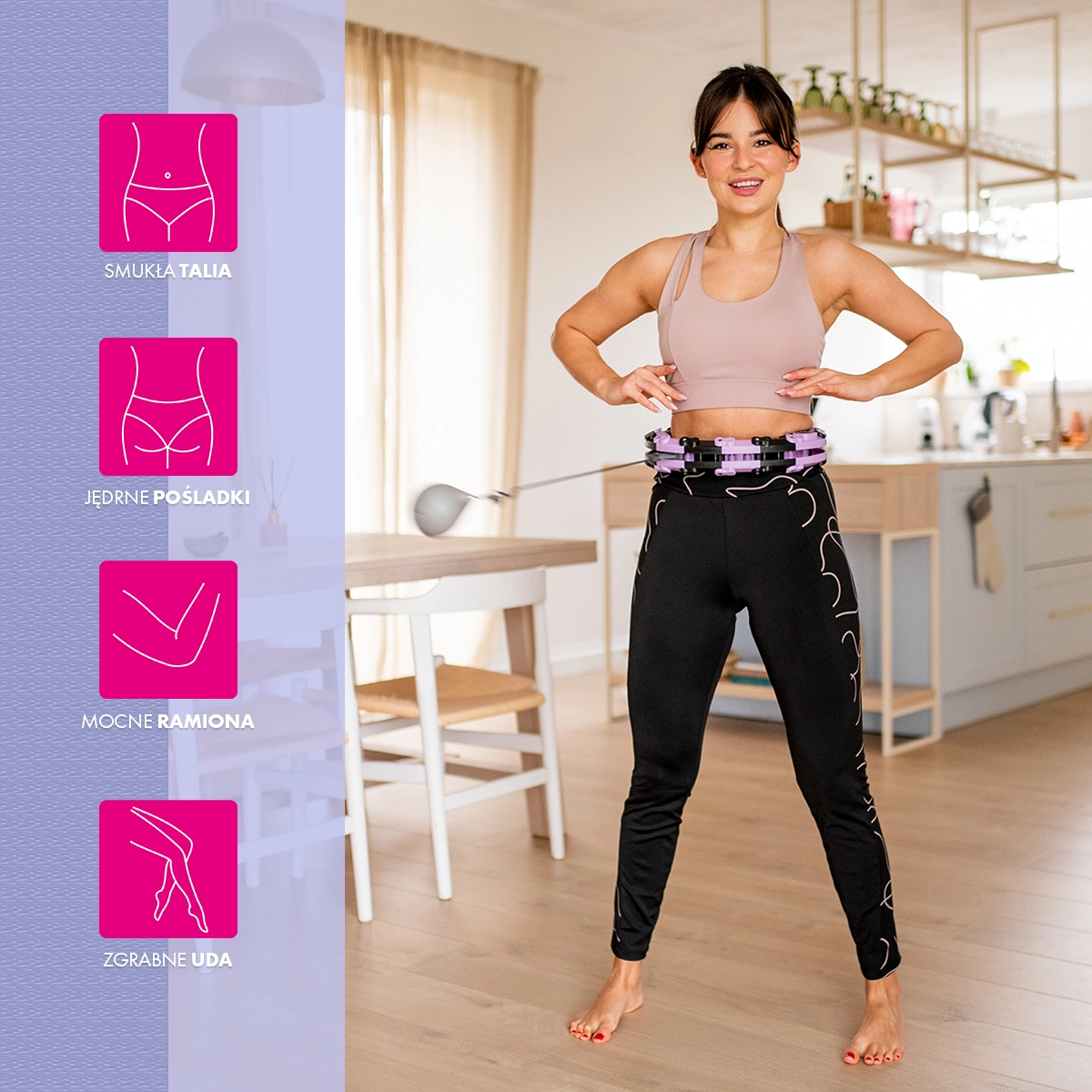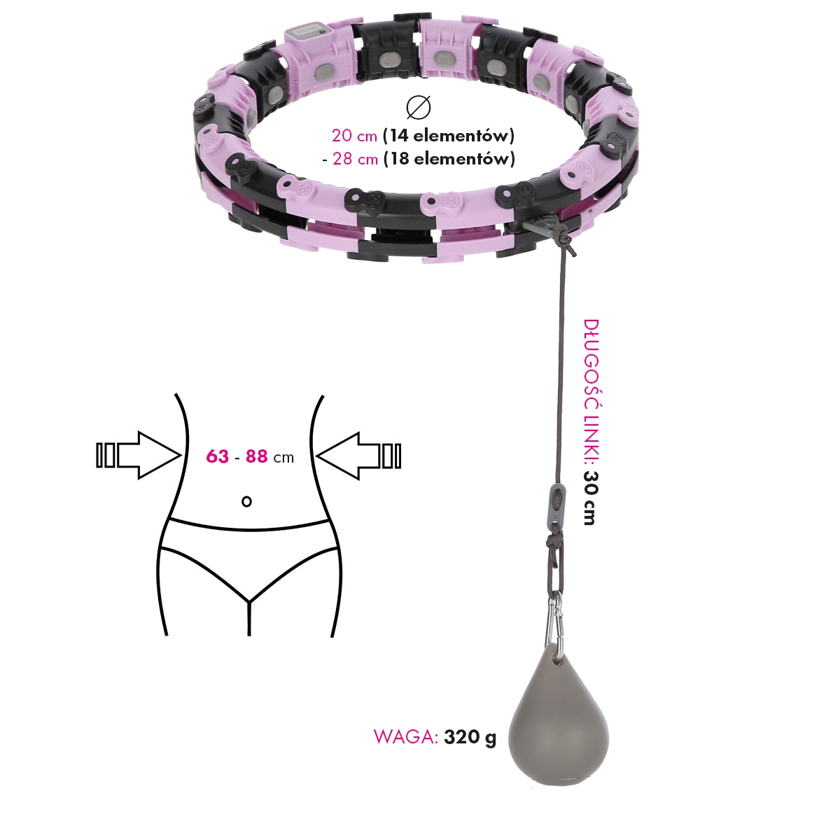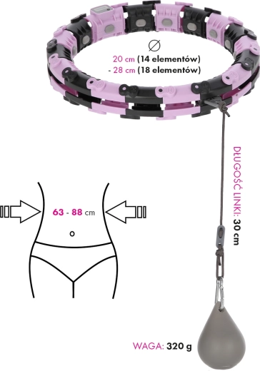 Modulárna konštrukcia z 18 dielov umožňuje rýchlo prispôsobiť obruč vášmu pásu (63–88 cm). Ľahko sa skladá a pevne drží počas cvičenia.