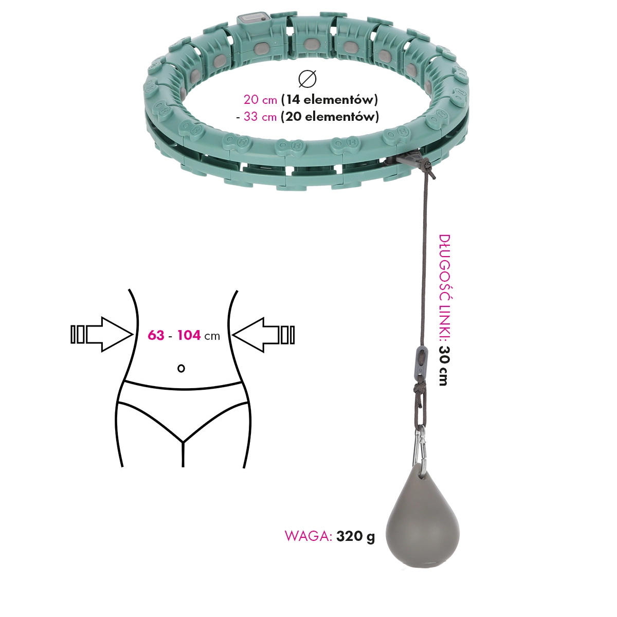 Inteligentný masážny kruh je navrhnutý pre pohodlné a efektívne spaľovanie kalórií v domácich podmienkach. Segmentová konštrukcia z 20 dielov umožňuje presné prispôsobenie obvodu pása 63–104 cm, takže kruh zostáva na mieste a nepadá cez boky. Vnútorné masážne výstupky tlmia vibrácie a zároveň príjemne masírujú stred tela.