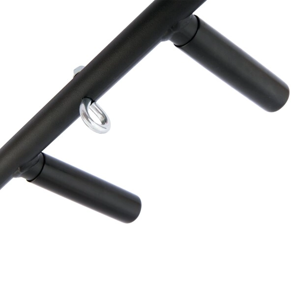 Masívny oceľový rám s práškovou povrchovou úpravou odoláva opotrebovaniu a gumové rukoväte poskytujú istý a komfortný úchop. Praktické centrálne oko rozširuje využitie hrazdy – zavesíte naň napríklad boxovací vak, odporové gumy či TRX popruhy.