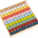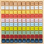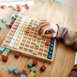 Drevená tabuľka s farebnými kockami s príkladmi násobilky