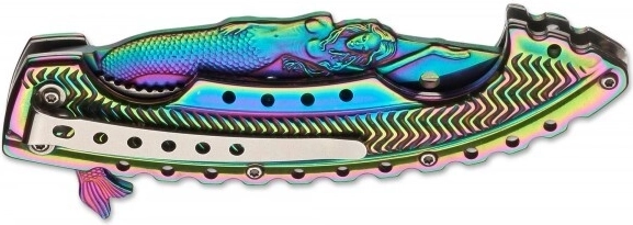 Rukoväť z nehrdzavejúcej ocele s dúhovým finisom zdobí motív morskej panny, pričom zakončenie chvosta slúži ako praktický vyklápač. Pre pohodlné nosenie je nôž vybavený vreckovým klipom, takže ho budete mať vždy po ruke, či už v meste, v prírode alebo ako výrazný kúsok zbierky.