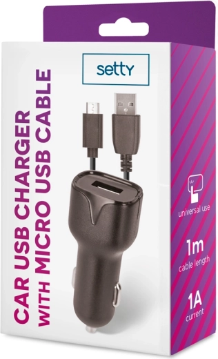 Kompaktná USB autonabíjačka SETTY s prúdom 1 A bezpečne dobije váš smartfón, GPS či MP3 počas jazdy. Obsahuje 1× USB port a dodáva sa s microUSB káblom 1 m v elegantnej čiernej farbe. Podporuje vstup 12–24 V DC, takže je vhodná pre osobné autá aj nákladné vozidlá.