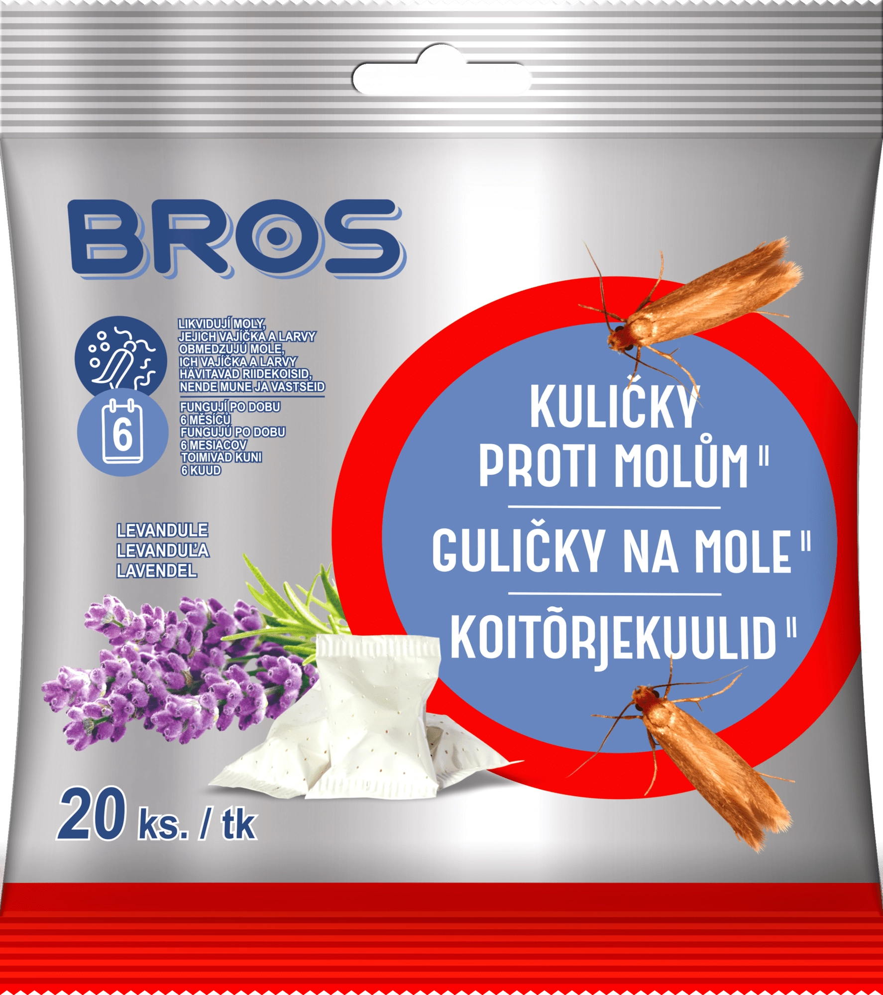 Praktické guľôčky proti moliam BROS spoľahlivo chránia vaše oblečenie, textílie a kožuchy v skrini pred poškodením. Majú príjemnú levanduľovú vôňu, pôsobia až 6 mesiacov a každá guľôčka je v samostatnom perforovanom vrecúšku pre jednoduché a čisté použitie.