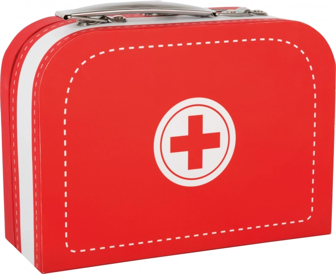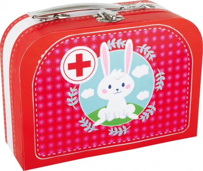 injekčná striekačka, teplomer, pinzeta, stetoskop, masť, tabletky, plyšový zajačik, prenosný kufrík