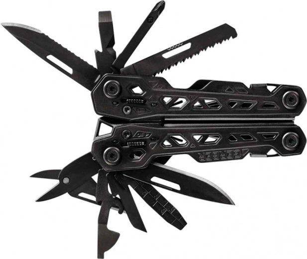 Funkcie (17): ihlové kliešte, klasické kliešte, štikacie kliešte na drôty, odizolovač, nôž s hladkým ostrím, nôž so zubatým ostrím, pilník, pílka, nožnice, šidlo, pravítko, otvárač na fľaše, otvárač na konzervy, krížový skrutkovač, malý plochý skrutkovač, stredný plochý skrutkovač, veľký plochý skrutkovač.