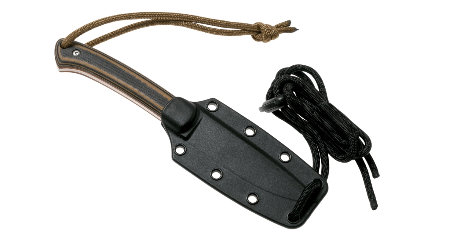 Rukoväť z viacvrstvového materiálu G10 v hnedo‑čiernom prevedení skvele sedí v ruke, je odolná voči vlhkosti a poskytuje istý úchop. Oko na šnúrku umožní pripevniť nôž či uľahčiť jeho vyťahovanie. Súčasťou balenia je ľahké plastové puzdro, ktoré môžete nosiť na opasku alebo zavesiť na krk – ideálne pre rýchly a bezpečný prístup.