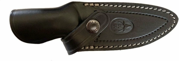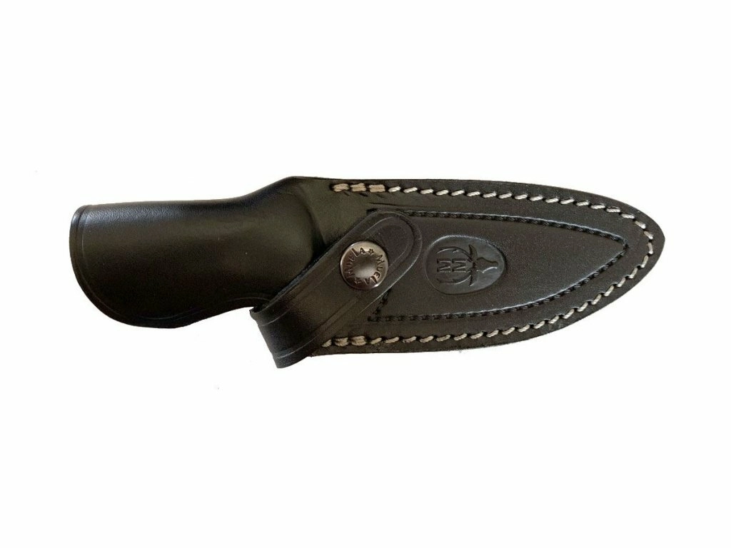 Textúrovaná rukoväť z čierno‑modrej Micarty výborne sedí v ruke aj za vlhka a ponúka istotu pri presných rezoch aj hrubšej práci. Praktický otvor na šnúrku uľahčuje istenie aj nosenie. Súčasťou balenia je kožené puzdro na bezpečné uloženie a pohodlné nosenie na opasku.