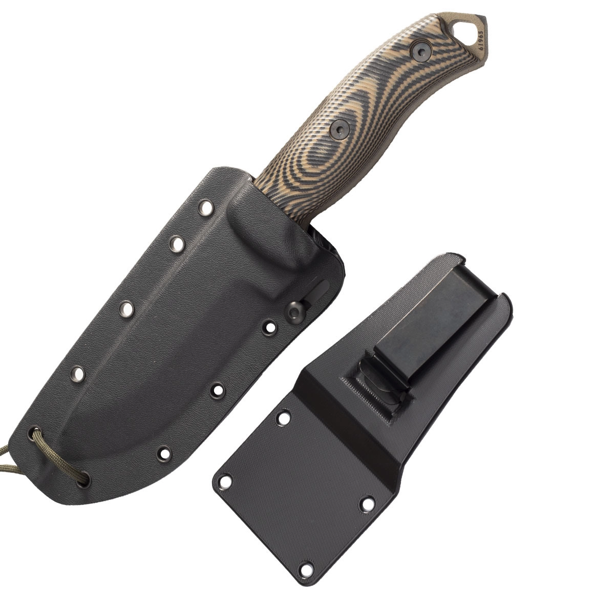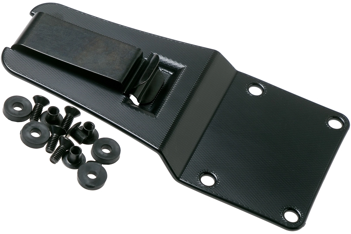 Odolné kydexové puzdro s viacerými priechodkami a odnímateľným klipom umožňuje bezpečné a variabilné uchytenie na opasok či výstroj.