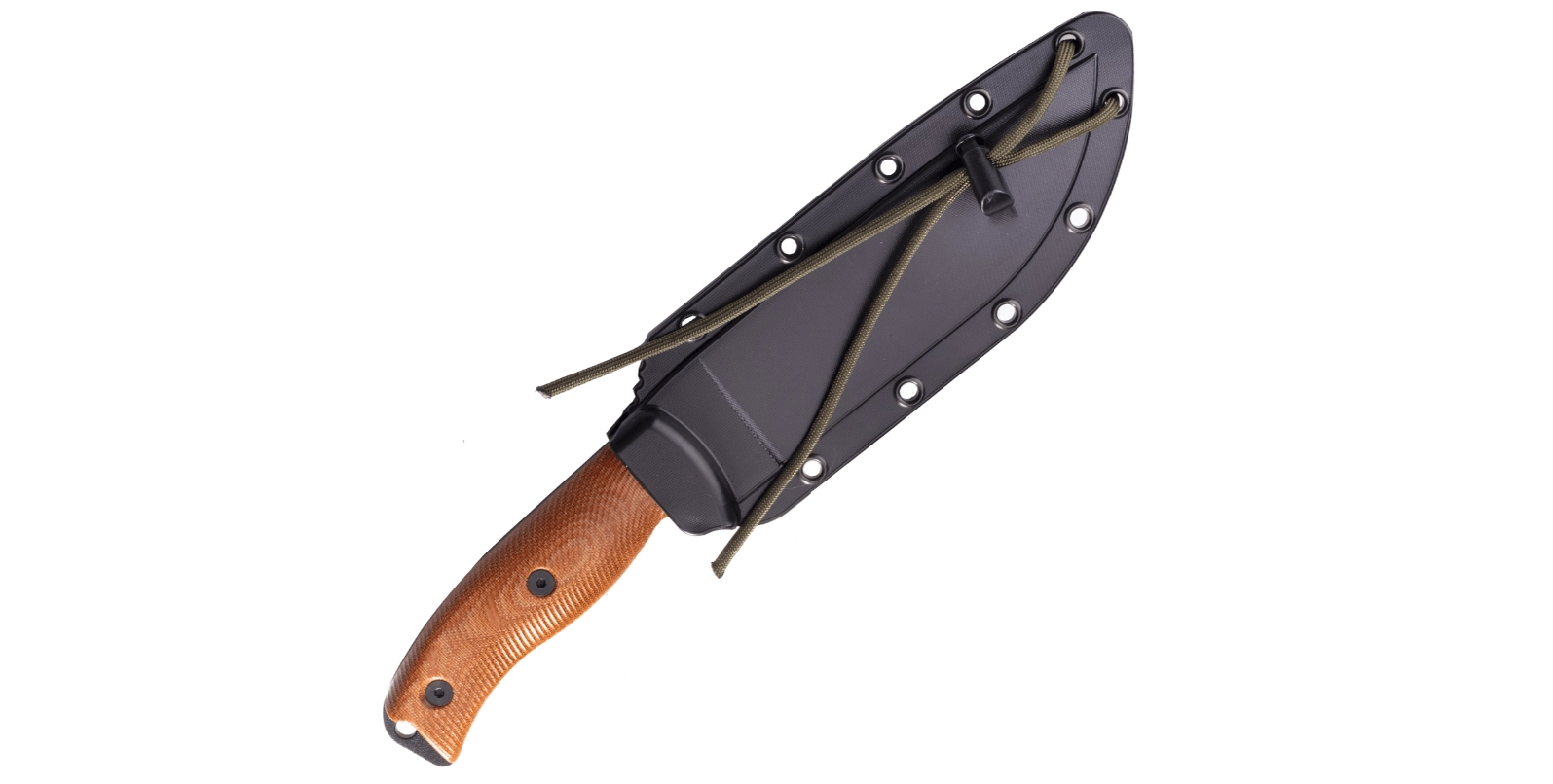 Ergonomická rukoväť z Micarty s hrubšou textúrou poskytuje bezpečný, nešmykľavý úchop aj vo vlhku. Plná tang konštrukcia zvyšuje pevnosť, jimping na chrbte a výrazný finger choil zlepšujú kontrolu nad čepeľou pri presných rezoch. Súčasťou je kydexové puzdro s množstvom otvorov pre viacpolohové nosenie a upevnenie na batoh či výbavu.